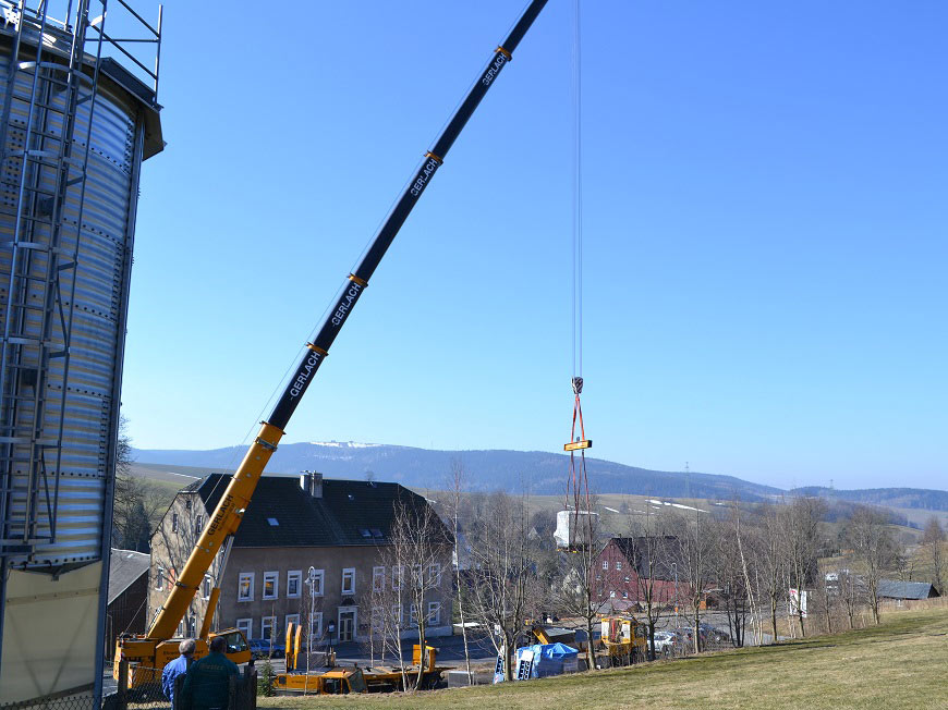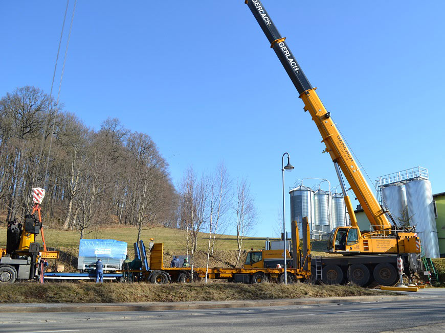 Aufgrund der benötigten Ausladung von über 30 Metern haben wir unseren größten Autokran AC 140 eingesetzt. Über eine Dachöffnung wurde die alte Anlage aus dem Gebäude gehoben und auf einem Tieflader abgesetzt. Die neue Abfüllanlage wurde dann ebenfalls über die Dachöffnung ins Innere verbracht und an ihrem Standort positioniert. Koordiniert wurde der Einsatz über Funkanweisungen.