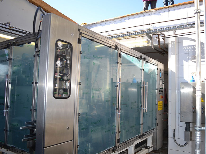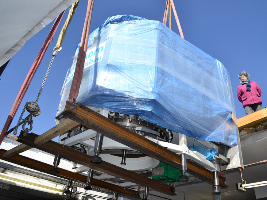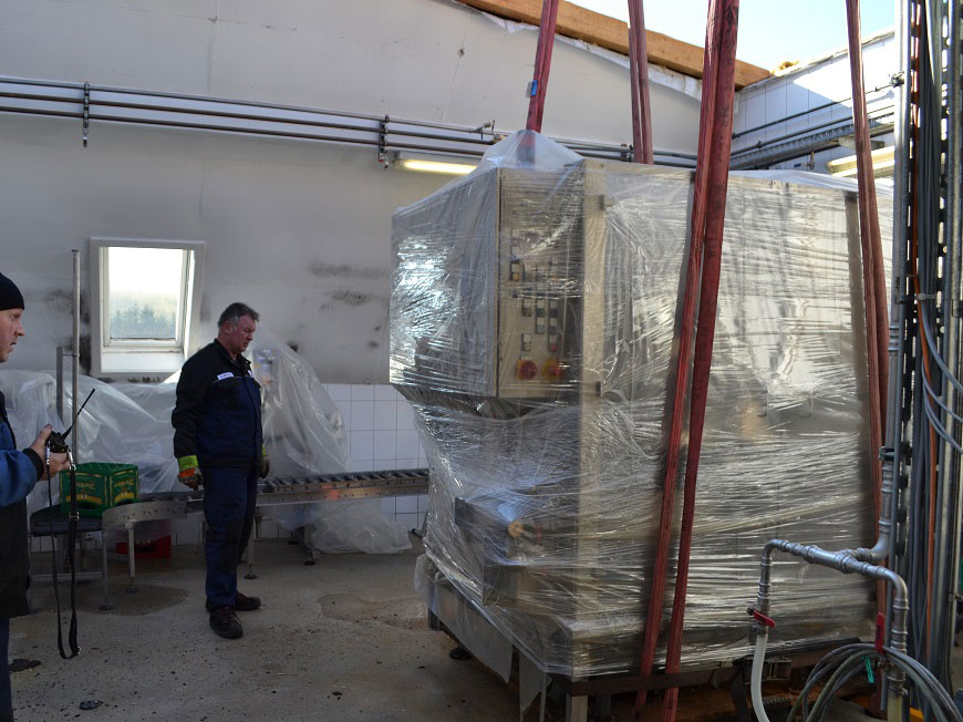 Ausbringen der alten Abfüllanlage und Einbringen einer neuen, generalüberholten Anlage (Masse ca. 6 Tonnen), Zugang zum Standort der Abfüllanlage war nur über eine Öffnung im Dach möglich