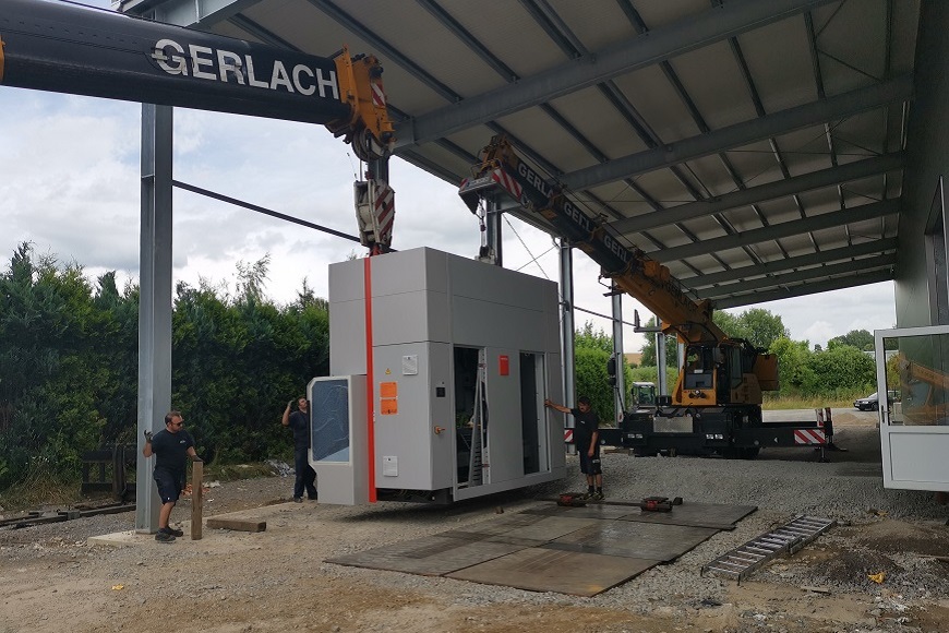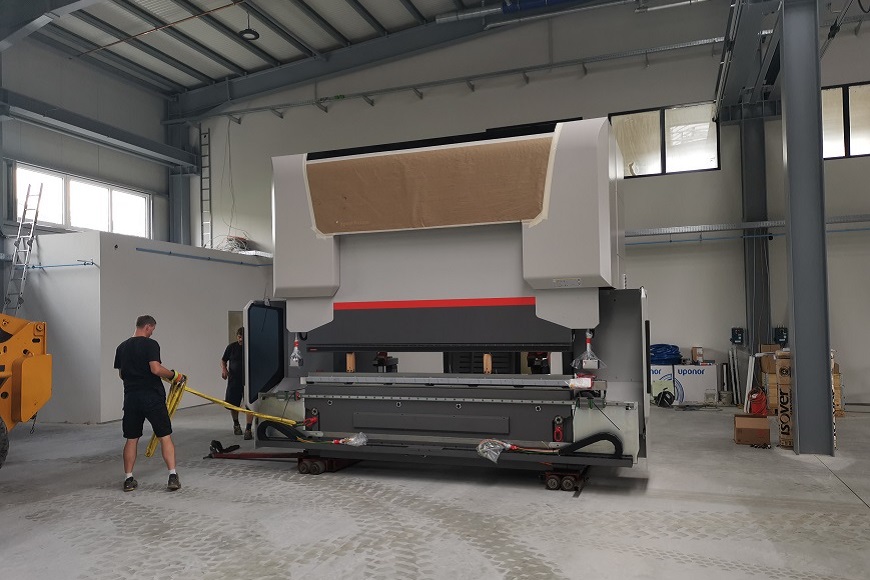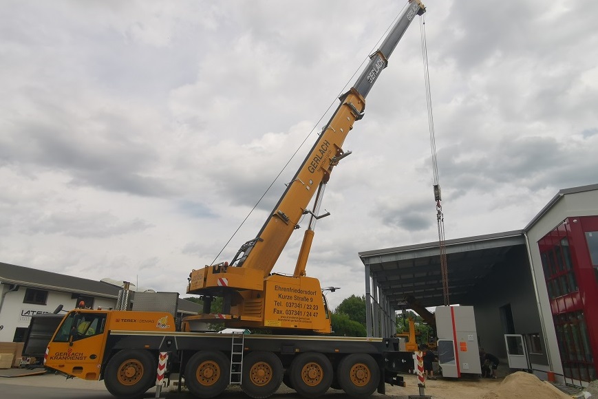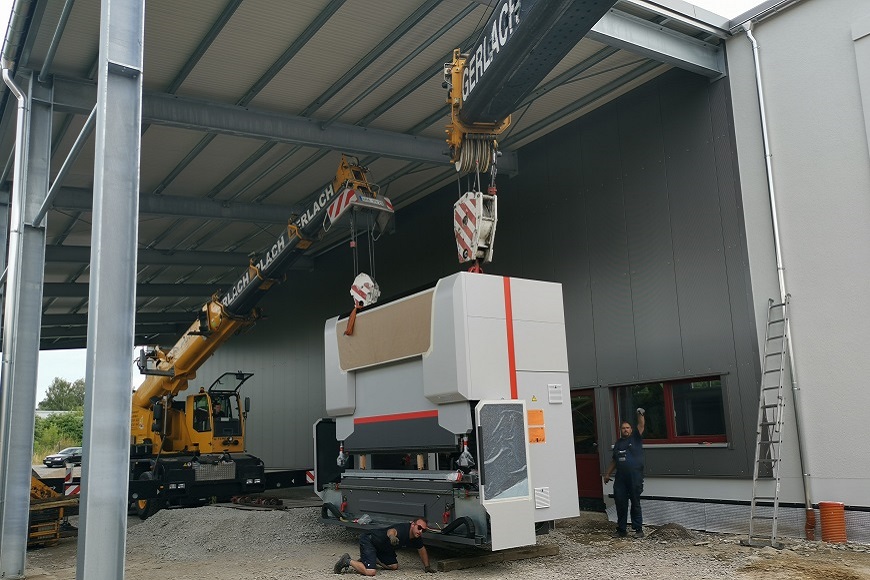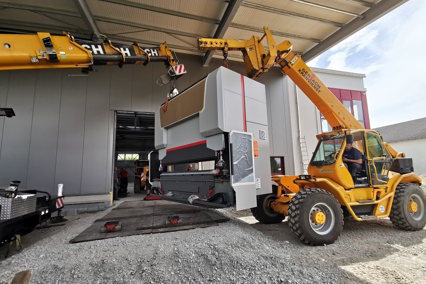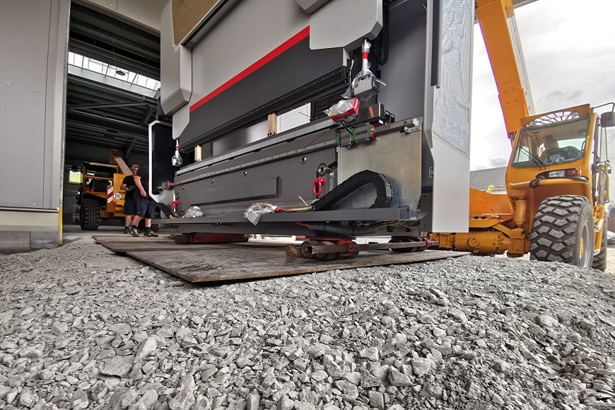 Entladen und Einbringen einer Abkantpresse (19,5t), über unbefestigten Untergrund, Behelfsrampe und Vordach
