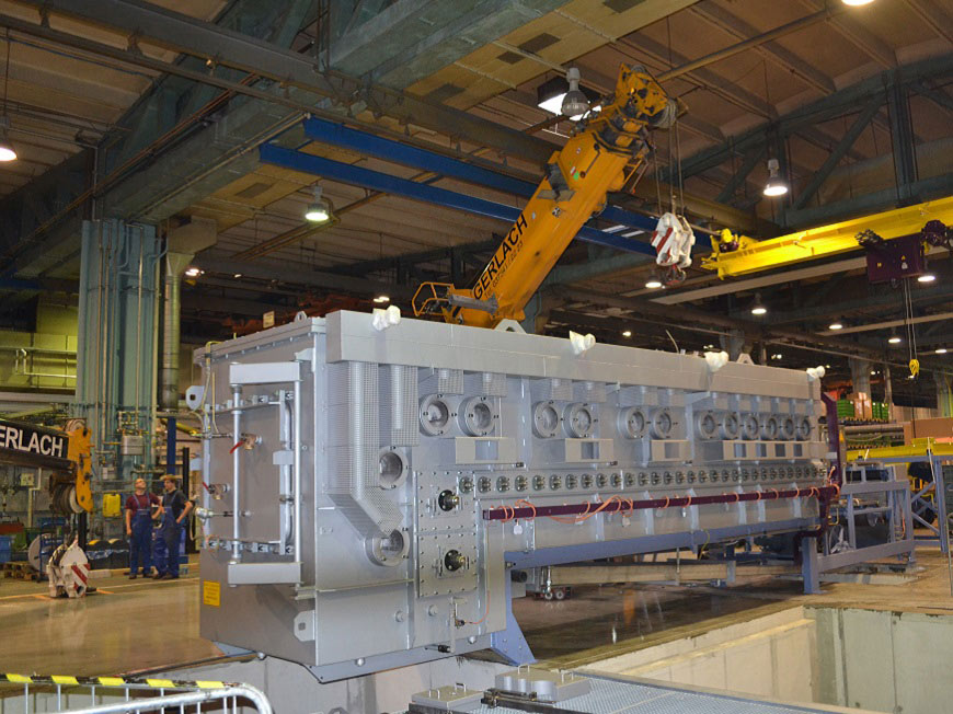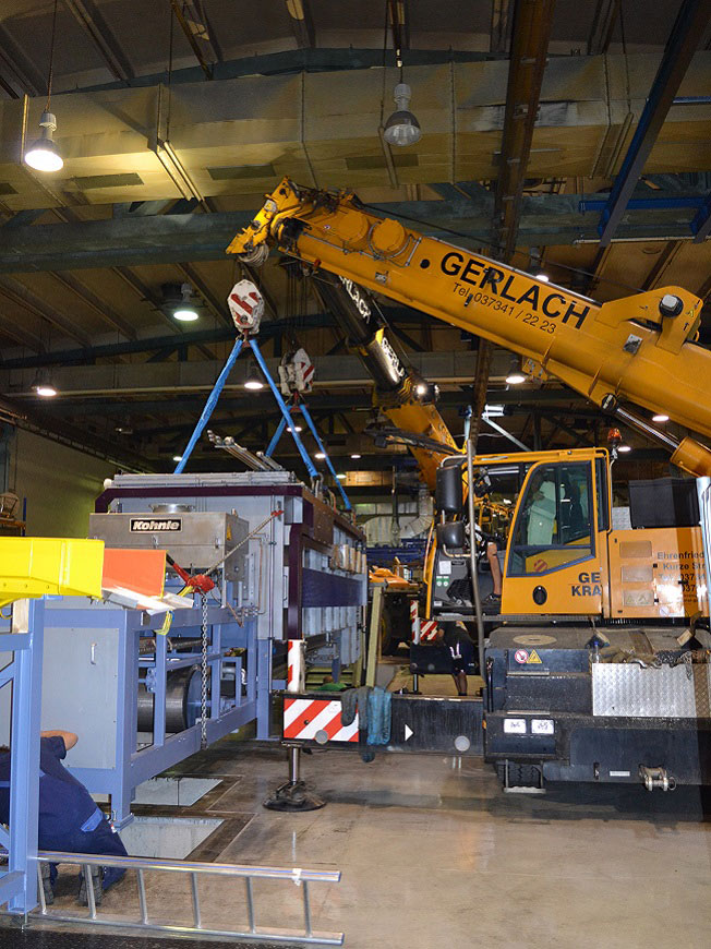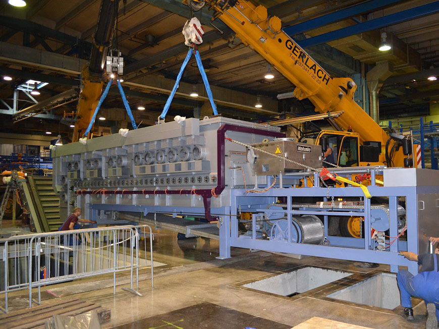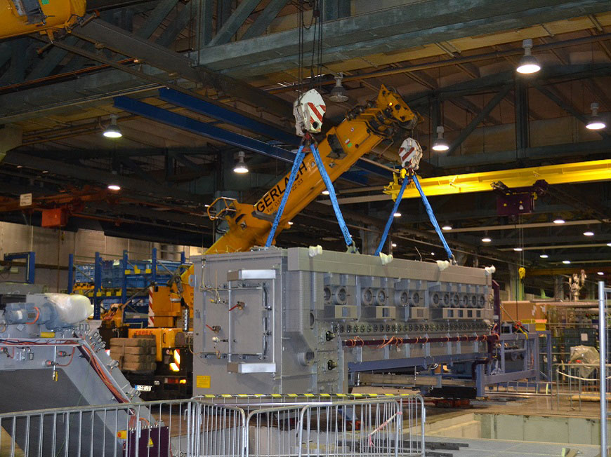 Entladen und Einbringen eines neuen Härteofens (Masse ca. 23 Tonnen)