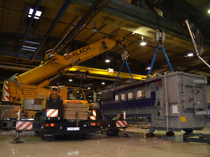 Nach der Entladung mit unserem Autokran AC 70 wurde der Härteofen auf Schwerlastfahrwerke gesetzt und mit Hilfe des Autokrans ins Innere der Halle zum Bestimmungsort gebracht. Zur Positionierung des Härteofens nutzten wir einen zweiten Autokran AC 40, um den Härteofen im Doppelhub an seinen Bestimmungsort zu setzen und auszurichten.