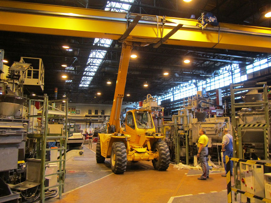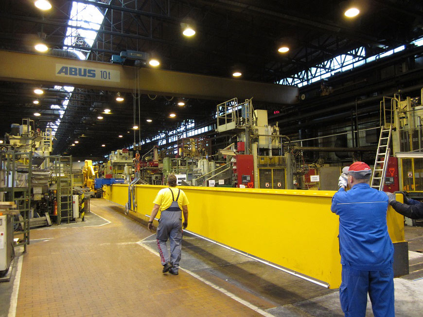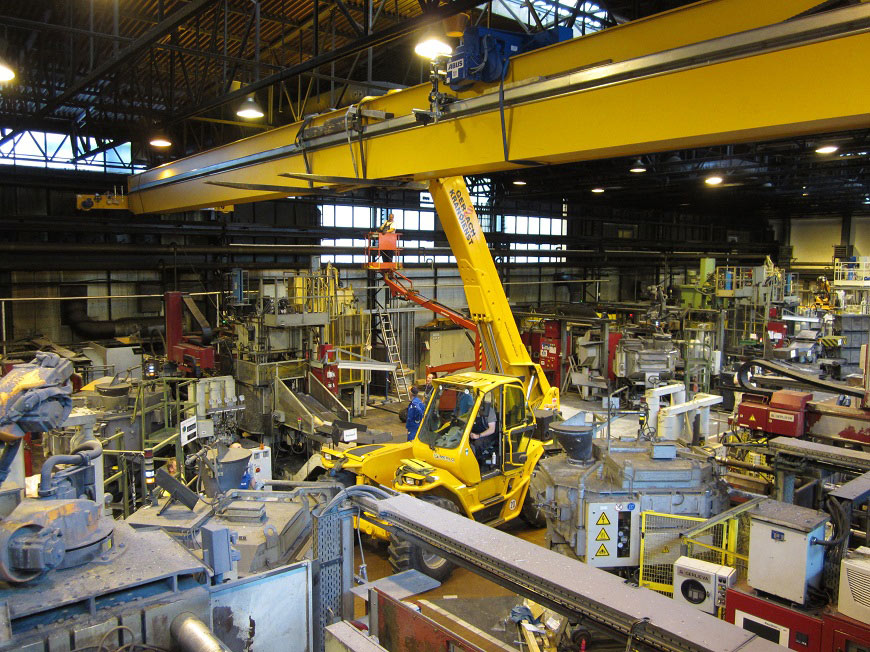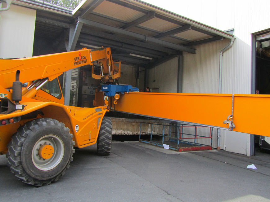 Der Kranbahnträger wurde mit Hilfe unseres Teleskopgabelstaplers Merlo 101.10, Schwerlastfahrwerken und eines kundeneigenen Gabelstaplers durch einen Seiteneingang in die Halle eingebracht und dort mittels Teleskopgabelstapler und der vorhandenen Kranbahn weiter zum Bestimmungsort gebracht. Mithilfe des Teleskopgabelstaplers wurde der neue Kranbahnträger in Position gehalten und montiert.