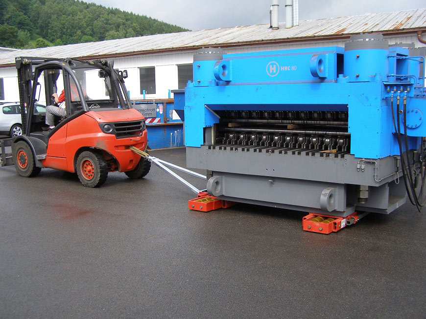 Transport einer Maschine auf Schwerlastfahrwerken über den Betriebshof