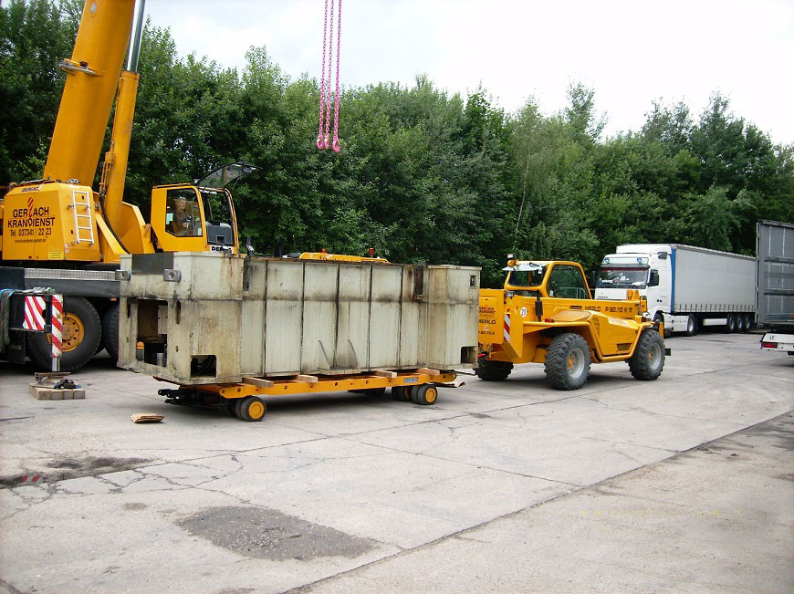 Ob Ein- und Ausbringungen von Maschinen auf Schwerlastfahrwerken innerhalb Ihres Betriebes oder bundesweit auf Achse mit dem Tieflader, bei uns sind Ihre Maschinen in guten Händen. Selbst Einzelgewicht bis zu 160t können von uns problemlos bewegt werden. Auf Wunsch organisieren wir auch Ihren kompletten Betriebsumzug inklusive sämtlicher De- bzw. Montagearbeiten.